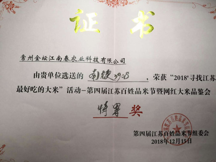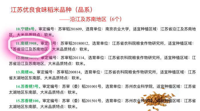 2.優(yōu)質(zhì)食味早熟晚粳新品種“南粳3908”獲稱“江蘇優(yōu)良食味稻米品種”。
