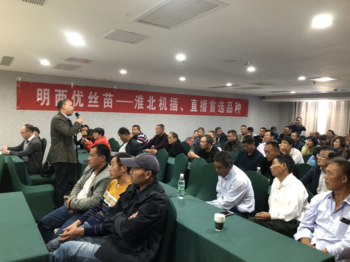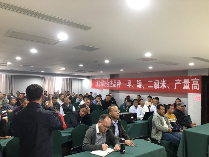 室內會議分為“品種特征特性介紹、田間表現分享”、 “推廣種植心得”、“后續品種介紹”三部分。會議由江蘇明天種業雜交水稻部部門副經理高俊賢先生主持,高經理首先對各遠道而來的客人表示熱烈歡迎,并希望明兩優絲苗的推廣能夠為江蘇雜交水稻輕簡化栽培發展做出新貢獻。